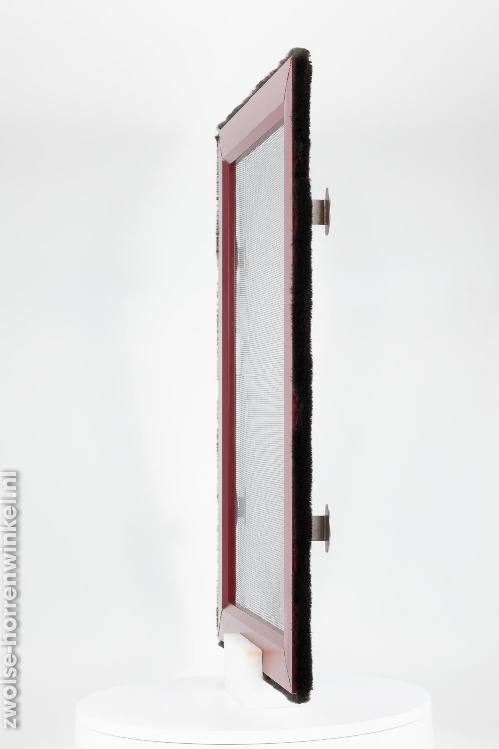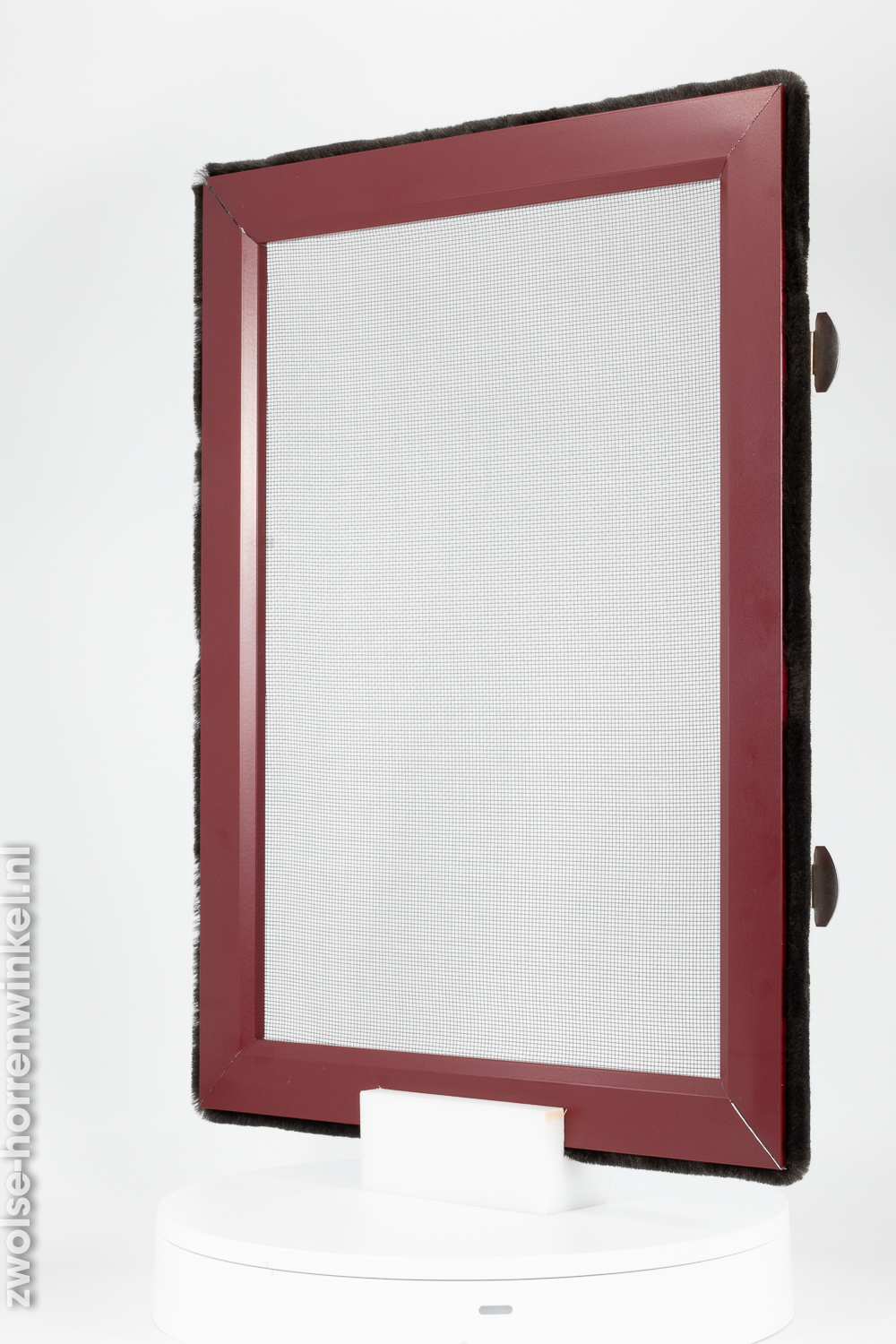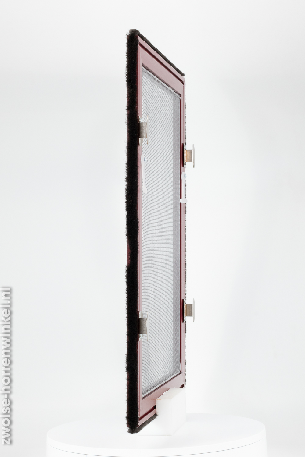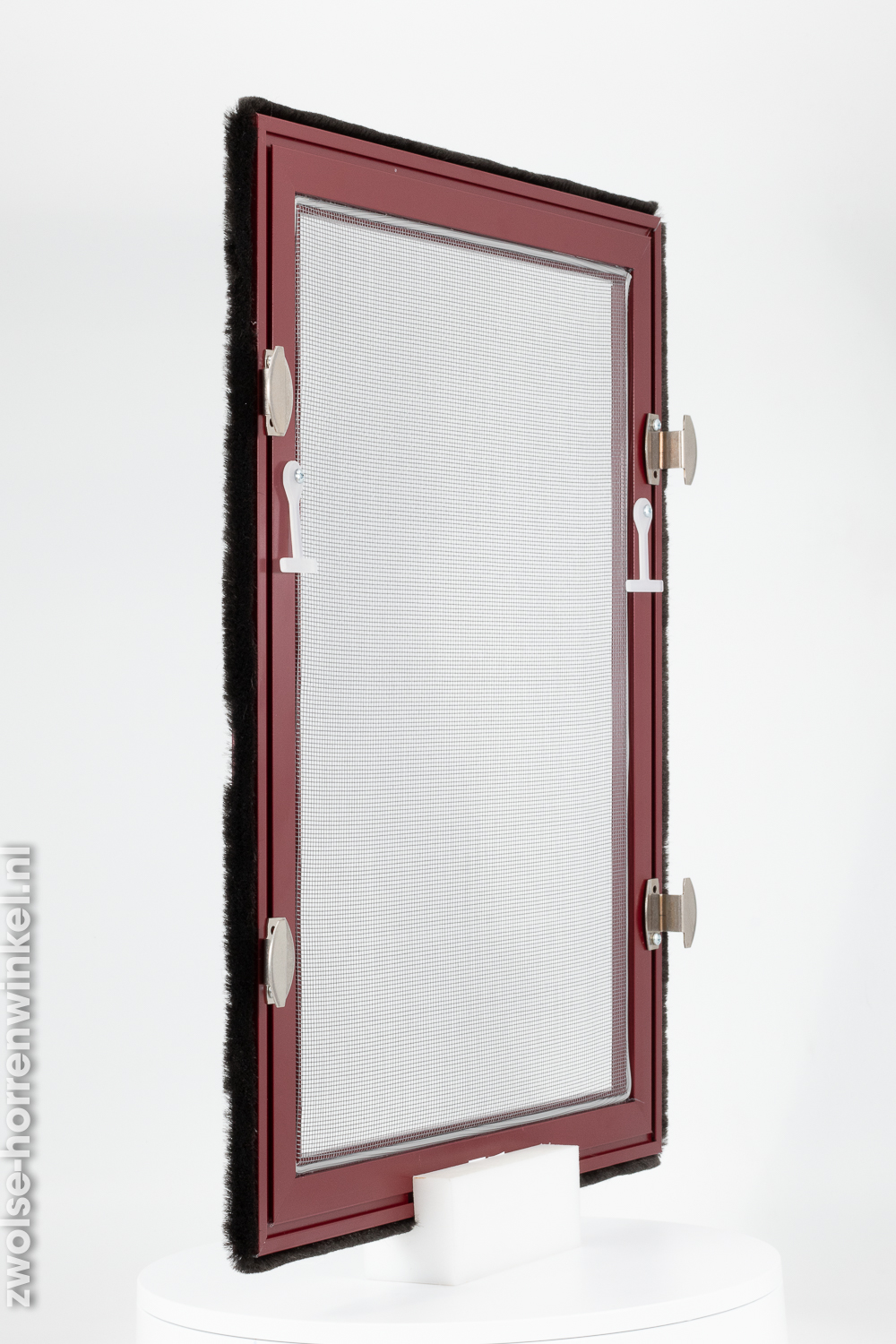 Deze wijnrode inzethor is geschikt voor vrijwel alle houten draaikiepramen en wordt zonder boren of schroeven in het kozijn geplaatst. De inzethor kan gemakkelijk worden geplaatst en worden weggehaald en is dus ideaal om insecten tegen te houden. Vanwege de uiterst dunne flens -0,8 mm-, neemt de druk op het beslag van het kozijn bij sluiten niet of nauwelijks toe. Daarnaast is dit product voorzien van een aluminium frame waar het gaas in wordt gemaakt. Het gaas is leverbaar in standaard insectengaas of tegen meerprijs met pollengaas.